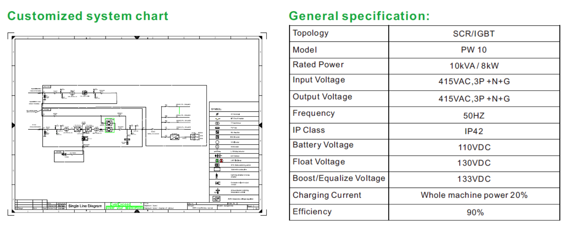 Tùy chỉnh linh hoạt: Hỗ trợ tùy chỉnh điện áp đầu vào/đầu ra, pha, tần số, định mức IP và dòng điện sạc để đáp ứng nhiều nhu cầu ứng dụng khác nhau.