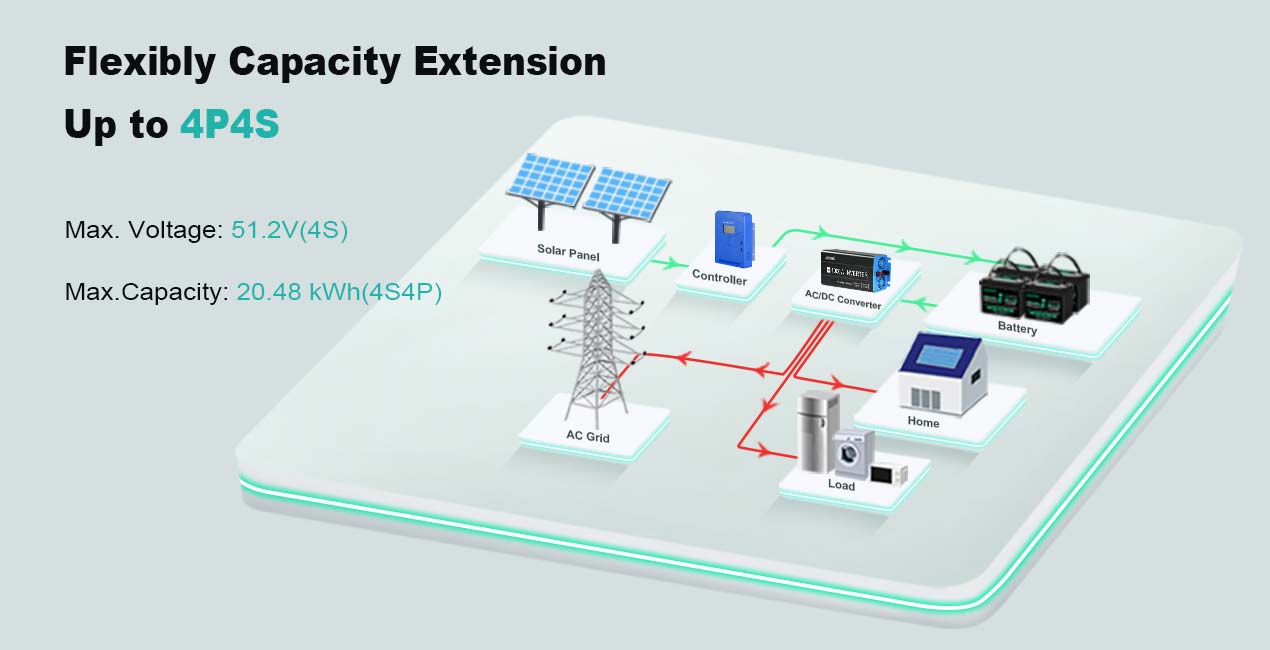 -- Điện áp tối đa khi mắc nối tiếp là 51.2V. Tức là, pin 12.8V có thể mắc được 4 mạch, và pin 25.6V có thể mắc được 2 mạch. Số lượng kết nối song song tối đa không được vượt quá 4.