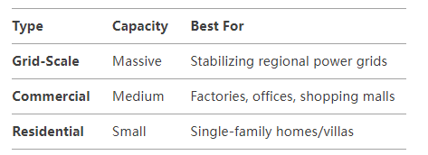 Hệ thống lớn (hàng trăm đến hàng nghìn kWh) hỗ trợ các hoạt động lớn hơn hoặc sử dụng trong công nghiệp.
