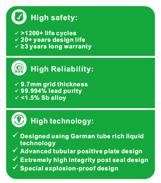 Tấm: Tấm lưới dày nhất trong ngành (9,7mm); Hợp kim canxi chì thiếc cao, được thiết kế với hàm lượng antimon thấp, Sb <1,5%; Chì nguyên chất 1, độ tinh khiết chì lớn hơn 99,994%;