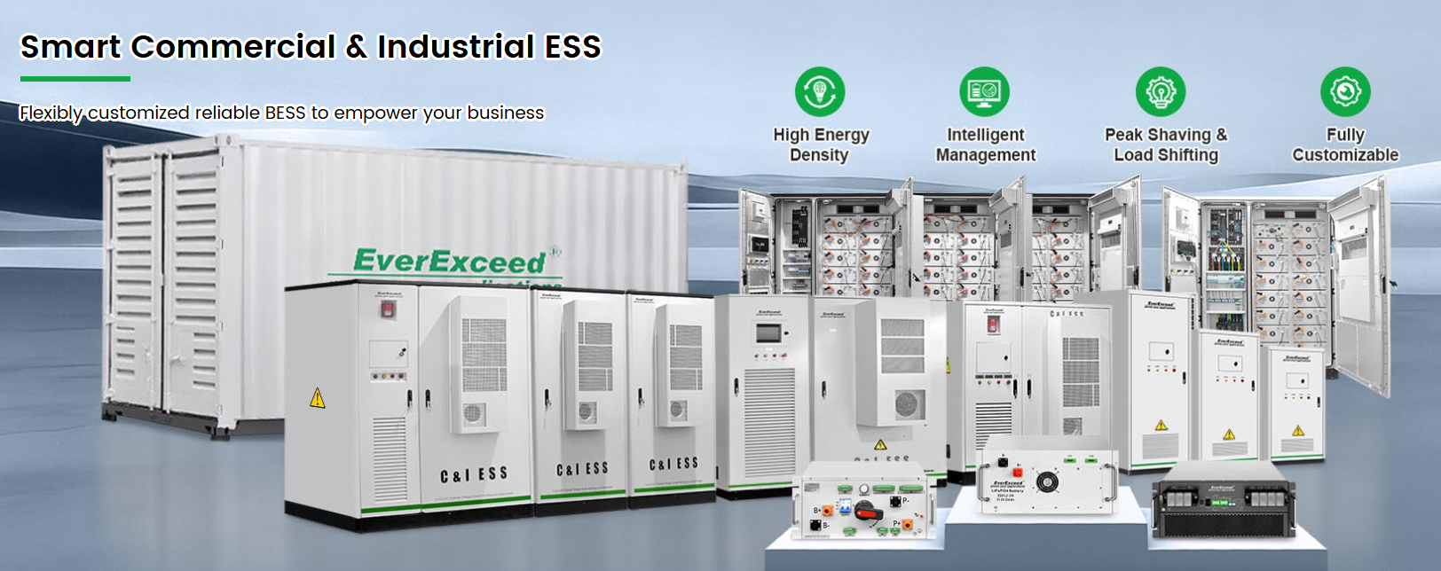 Với tư cách là một toàn cầu nhà sản xuất thiết bị lưu trữ năng lượng với hơn 20 năm kinh nghiệm trong sản xuất pin Với khả năng tích hợp hệ thống, EverExceed cung cấp các Hệ thống Lưu trữ Năng lượng Thương mại & Công nghiệp (C&I ESS) đáng tin cậy, hiệu quả và có khả năng mở rộng, giúp các doanh nghiệp tối ưu hóa chi phí điện năng, nâng cao độ tin cậy của nguồn điện và đẩy nhanh quá trình chuyển đổi năng lượng.