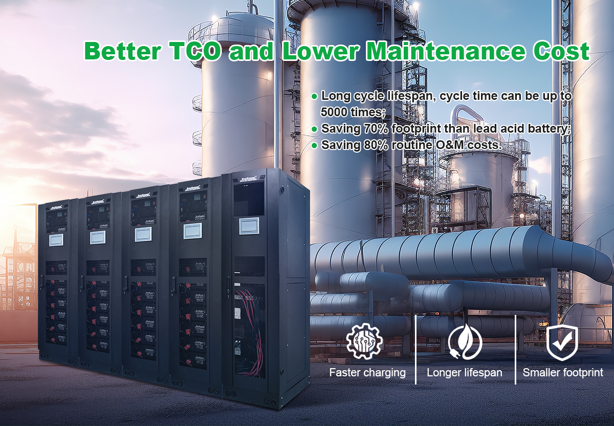 Đạt được TCO tốt hơn với chu kỳ lên đến 5000 lần, tiết kiệm 70% không gian và chi phí bảo trì thấp hơn 80% so với ắc quy axit chì.