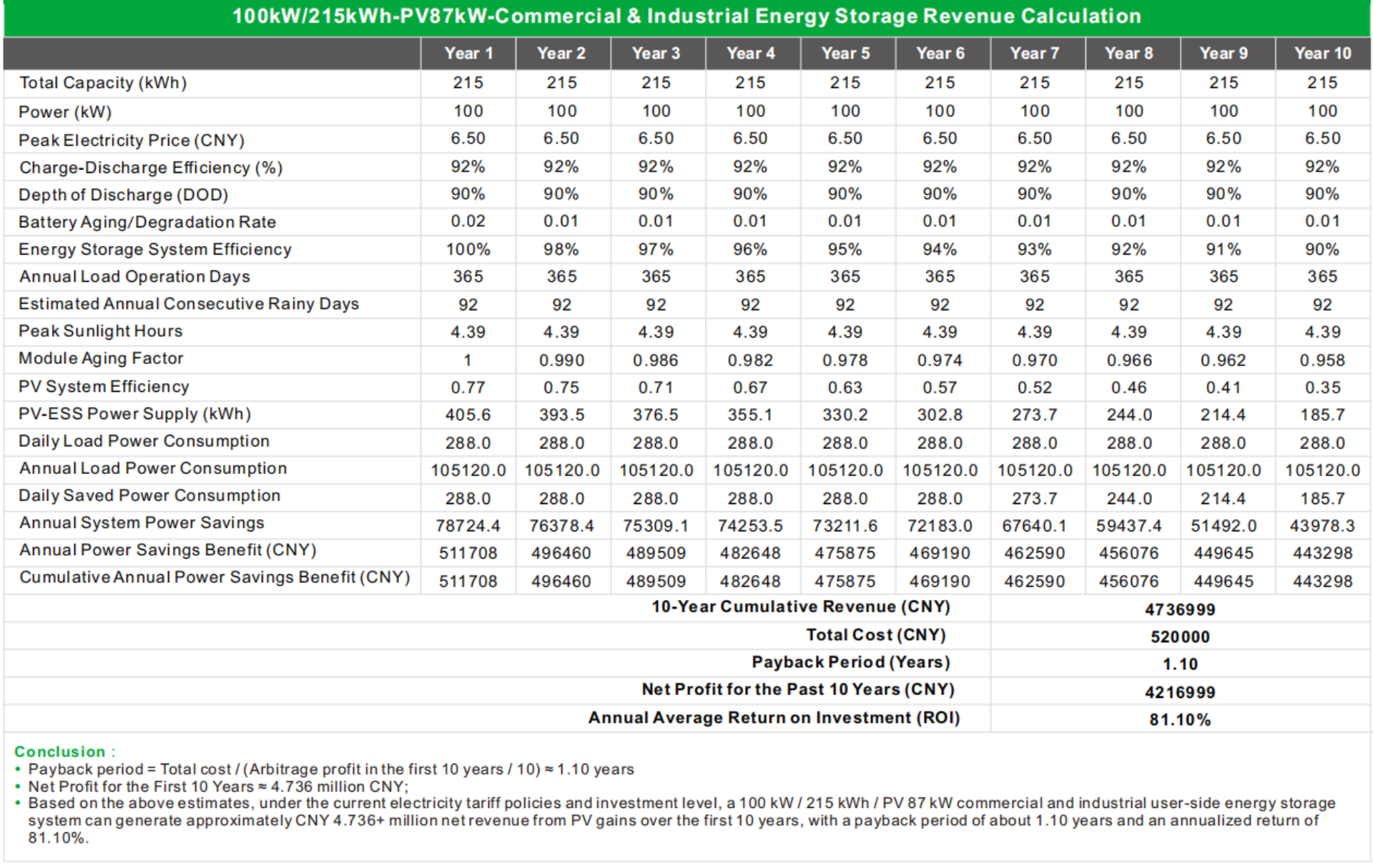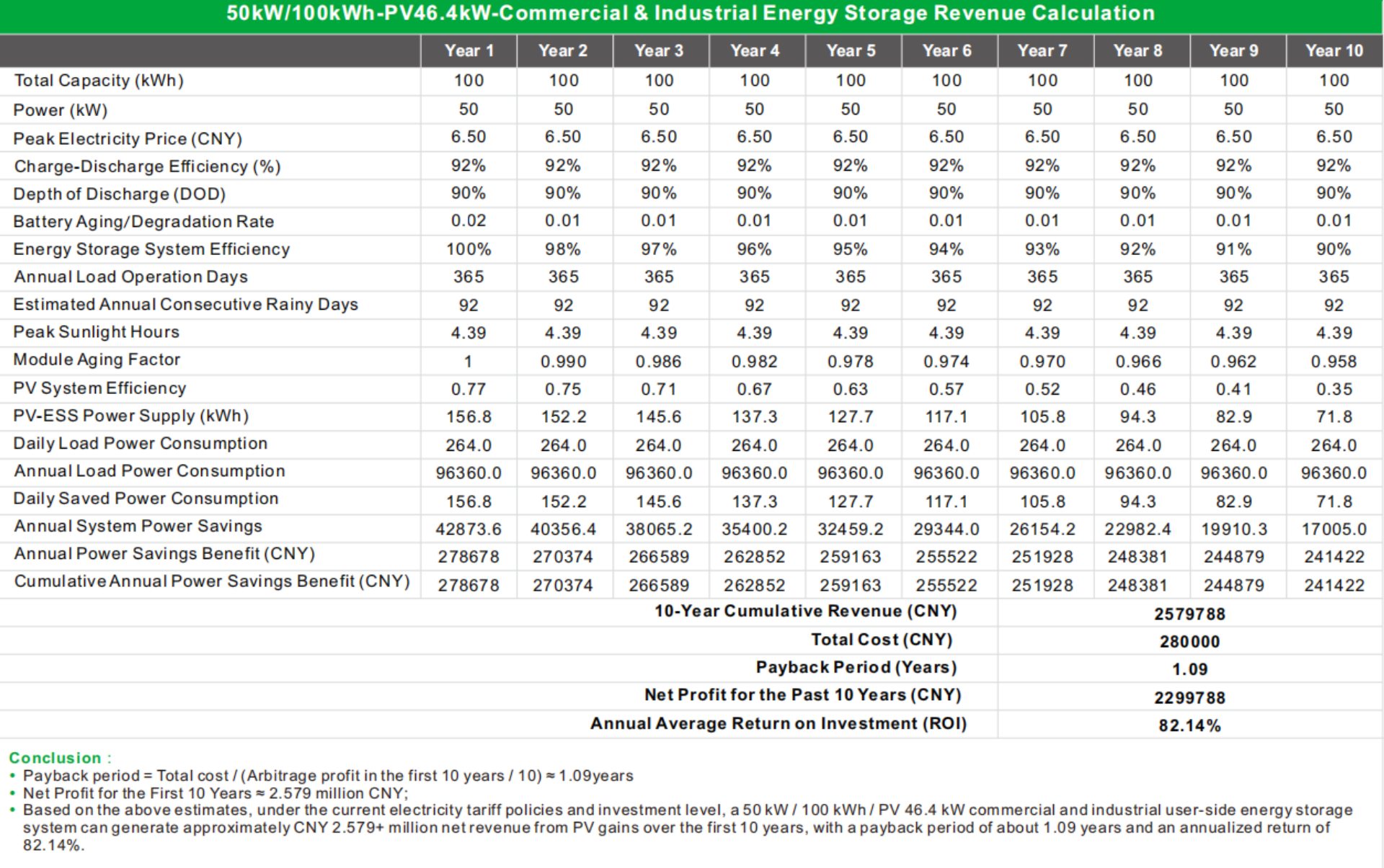 Lưu trữ pin: Bộ pin lithium sắt phosphate 51,2V/280Ah (7 bộ nối tiếp, mỗi bộ 14,3kWh, tổng dung lượng 100kWh), hỗ trợ sạc/xả 0,5C với BMS để theo dõi thời gian thực.