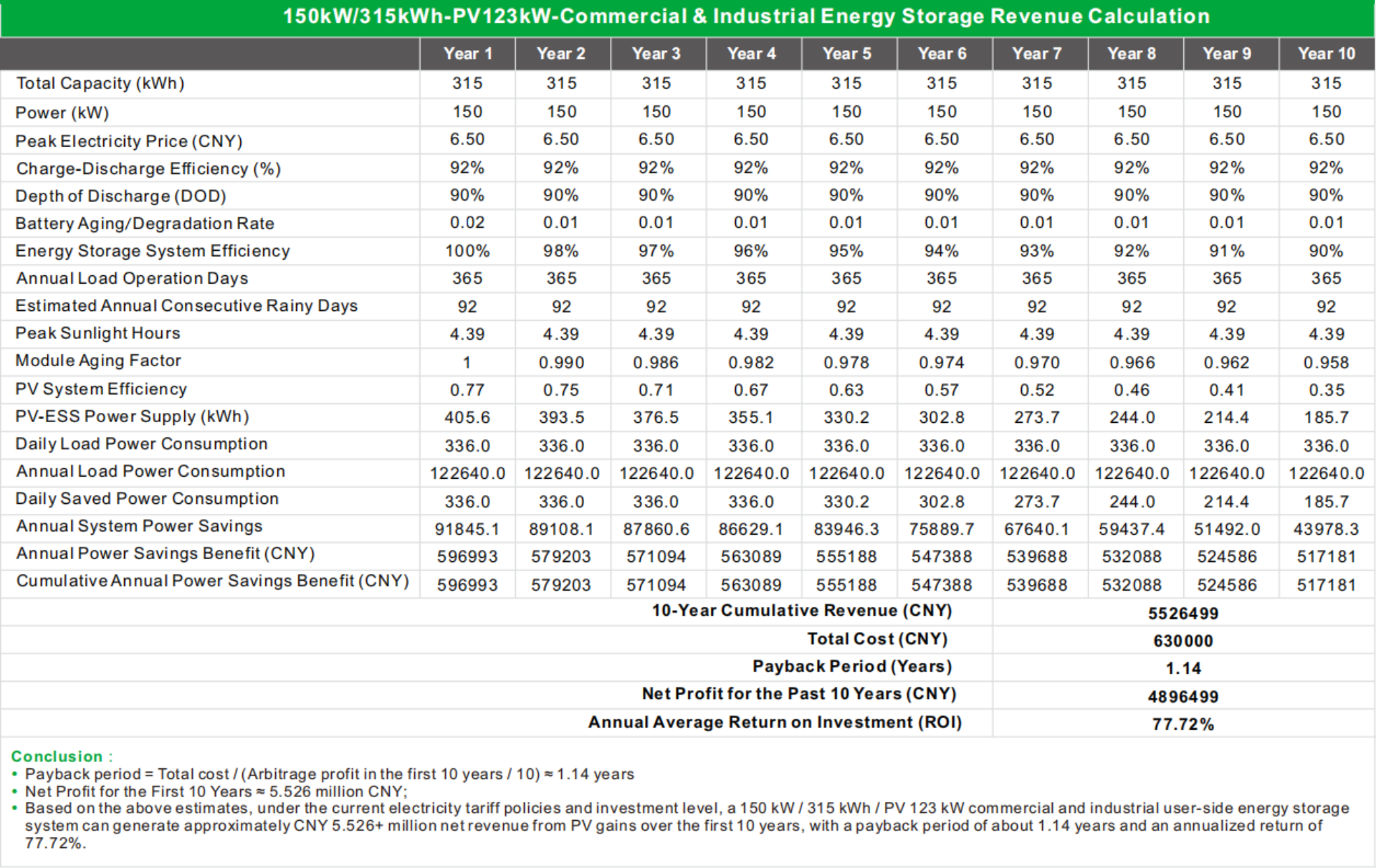 Lưu trữ pin: Bộ pin lithium sắt phosphate 51,2V280Ah (22 bộ nối tiếp, 14,3kWh mỗi bộ, tổng dung lượng 315kWh), hỗ trợ sạc/xả 0,5C với BMS để theo dõi thời gian thực.