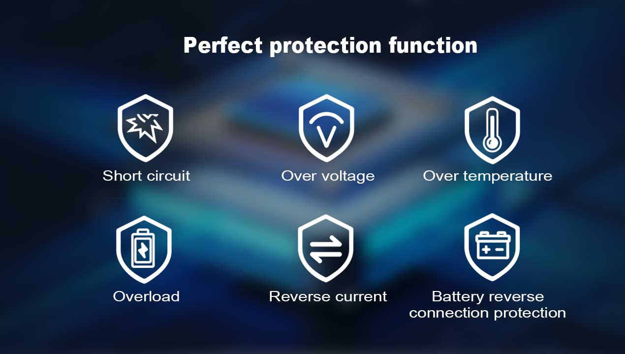 Bảo vệ toàn diện: bảo vệ quá áp, ngắn mạch, dòng điện ngược, bảo vệ quá nhiệt và thiết kế cách ly.