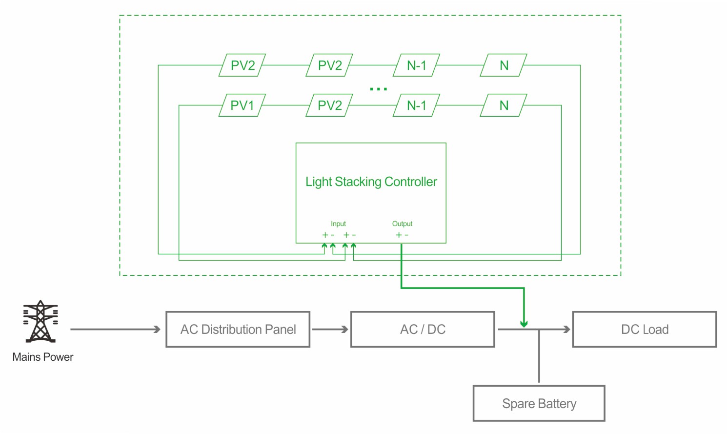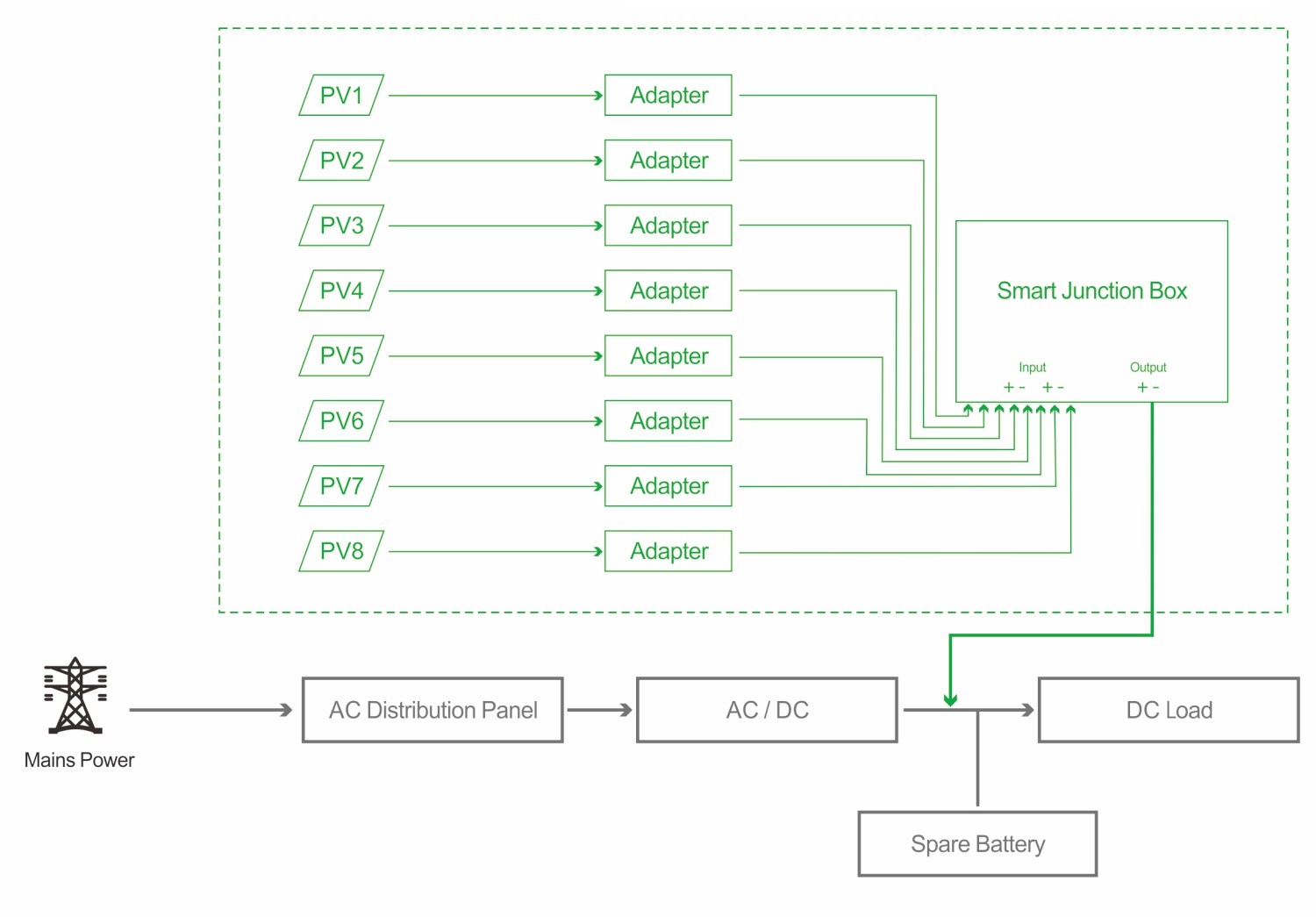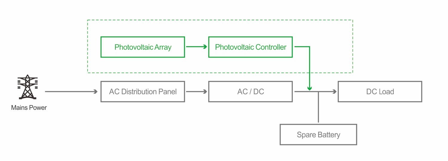 PV-Overlay tích hợp hệ thống quang điện bổ sung vào kiến trúc nguồn điện hiện có của trạm gốc viễn thông, cho phép cung cấp năng lượng kết hợp “PV + Lưới điện tiện ích”.